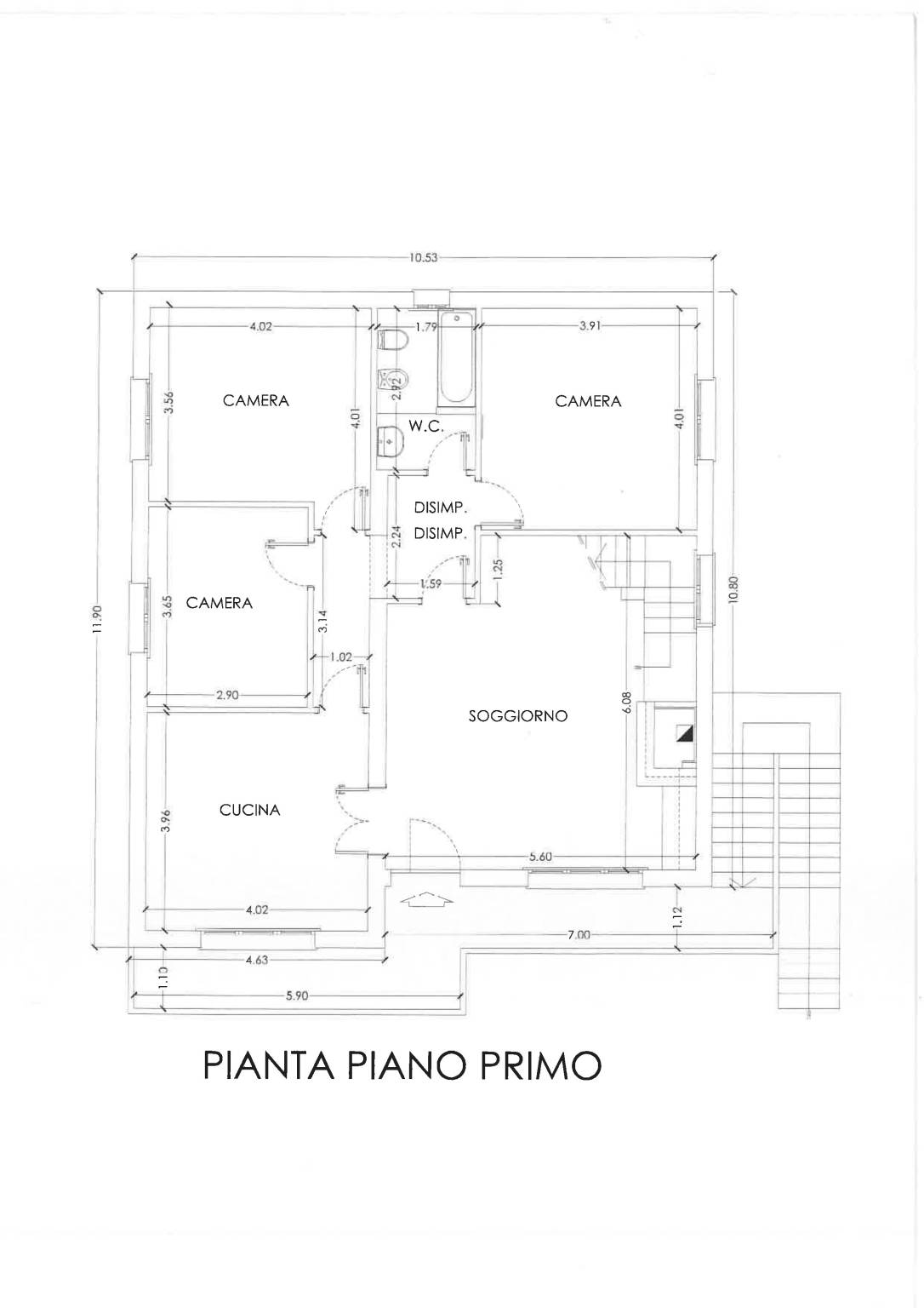 L'appartamento al piano primo si compone di ampio soggiorno/zona living con camino perfettamente funzionante, cucina separata abitabile con balcone, disimpegno, bagno con vasca, 3 camere da letto di cui 2 matrimoniali con possibilità di realizzare il secondo bagno adiacente ad una delle due matrimoniali, ed una cameretta.